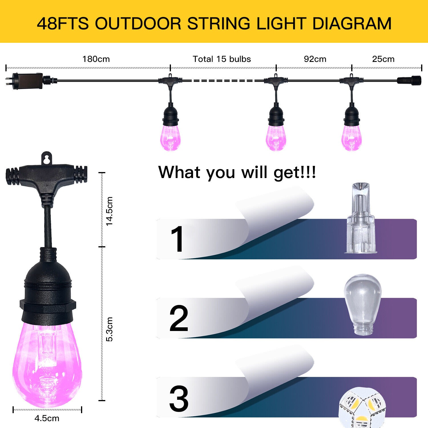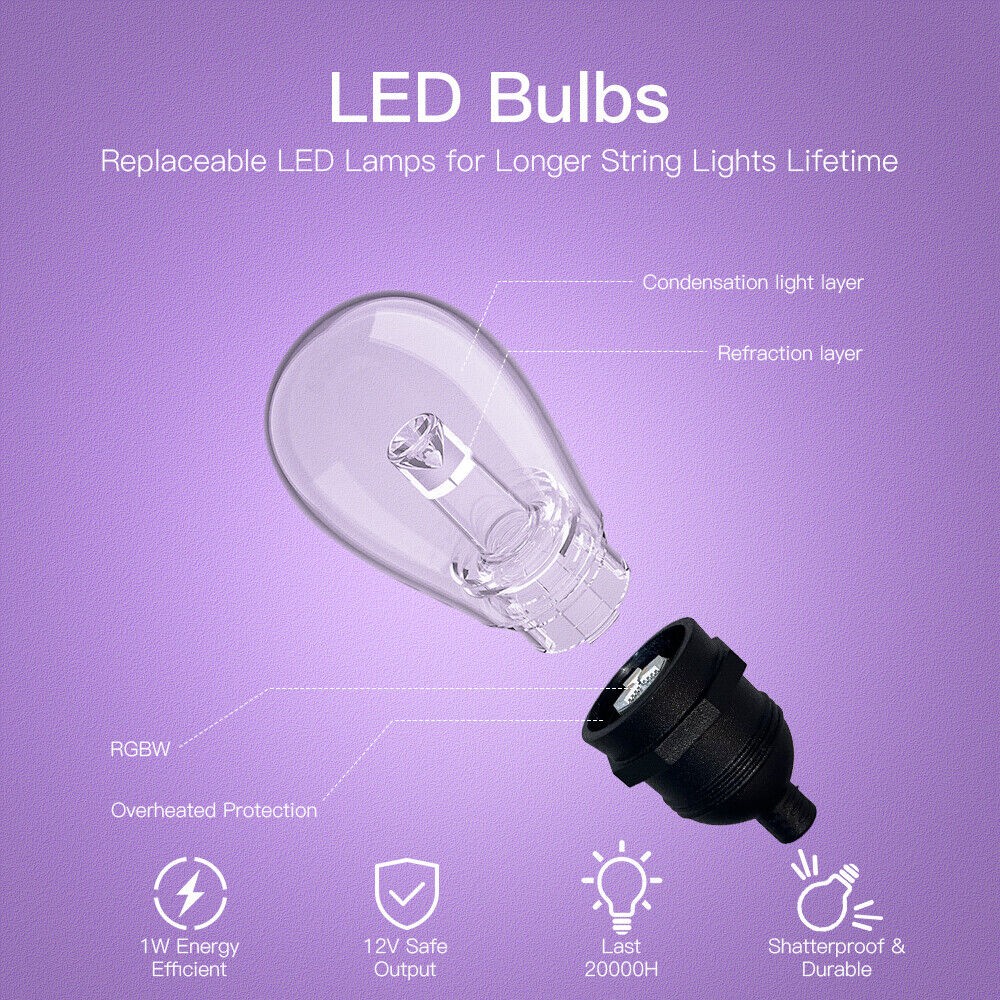 ?Connectable Festoon Lights--- Up to extend connect 3 string lights kits together (Each set 15M/48ft) by Male-Female connector, and up to control 45 Bulbs via WiFi App directly, no need to pair again; Ideal for patio, deck, backyard fence, pergola, porch, bistro, cafe.