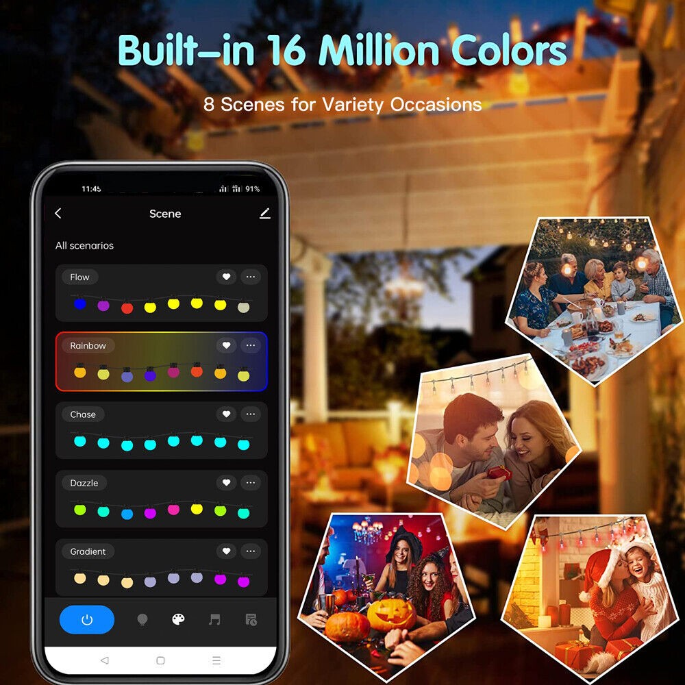 ?  Custom DIY Setting--- Dimmable & Scene Music Sync & Schedule,via WiFi App,You could adjust the brightness,also modify or pick a specific color or speed from multi modes/themes,Lots of color scheme to choose from; and the app has several preset light modes,Like: Flow/Rainbow/Chase/Dazzle/Gradient/Jump/Breathing/Blink;and also add a timer schedule ; Choose “Music” mode(Rhythm/Game/Romantic) in the App,the colorful patio string lights will spectrum with light and color changing automatically base on the ambient sound;