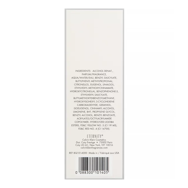 ETERNITY perfume was introduced by CALVIN KLEIN in 1988. This romantic floral fragrance contains freesia, mandarin, sage, muguet, white lily, patchouli, and sandalwood. Eternity body lotion worn with the perfume creates a romantic and luxurious fragrance all over. Eternity perfume is packaged in a clear glass bottle with a silver cap and is enclosed in a classic clean white box. Other fragrances from Calvin Klein include Eternity Moment and CK One.